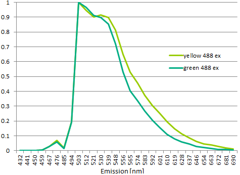 Spectra of the two slides as measured with excitation by 488 nm laser and measured on Zeiss 880 confocal in lambda mode.