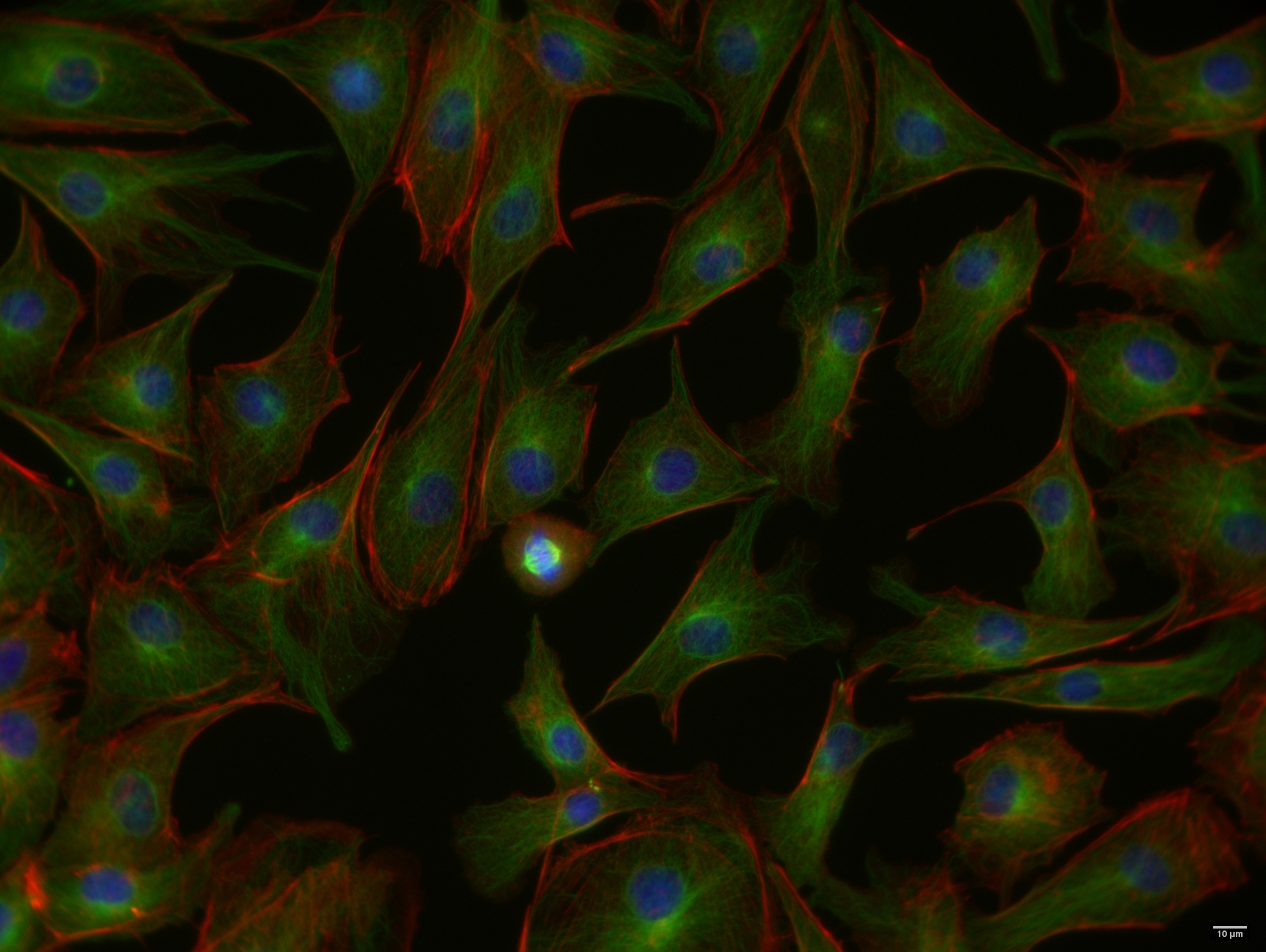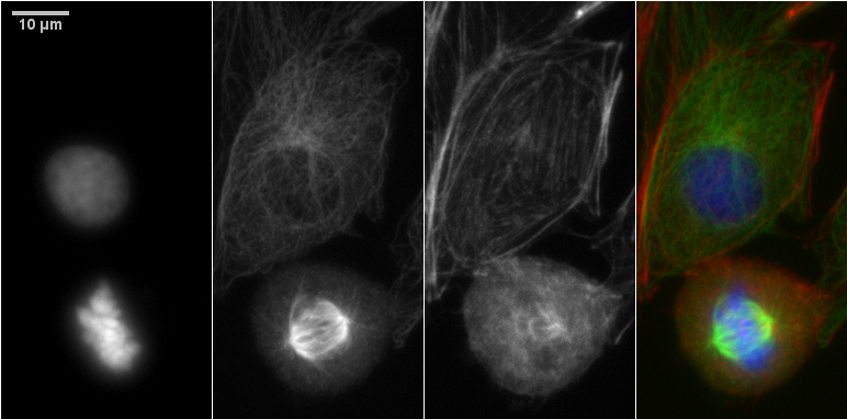 From left to right: DNA, tubulin, f-actin, merged of Molecular Probes prepared sample F14781.