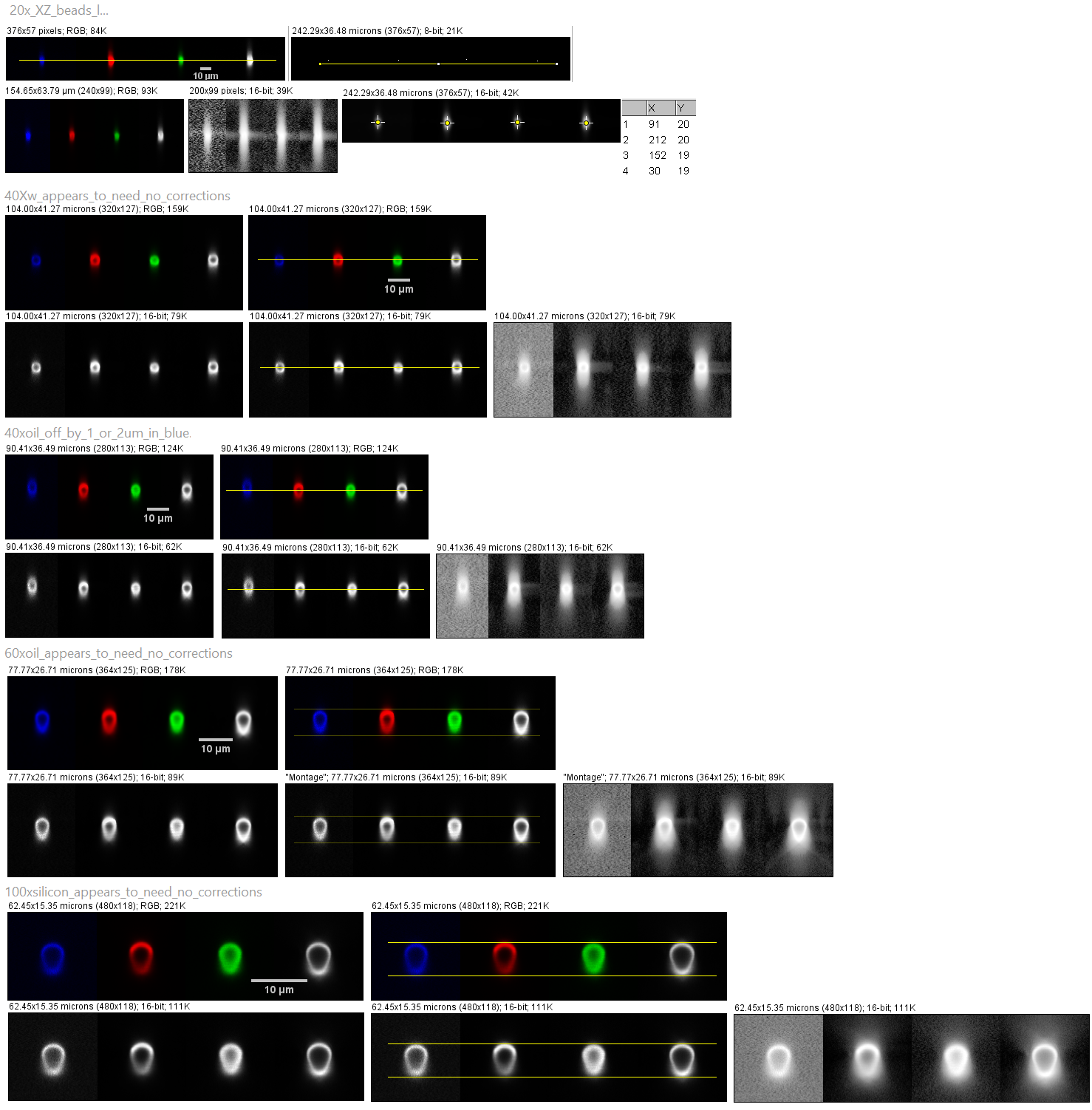 All the images below are XZ reslices through Z series taken with orthogonal sampling. The horizontal yellow lines mark a single focal plan. The last image in each block is contrast equalized to show scattered light. Only for the 20X lens were the bead centers located by two different methods and measured by the find maxima method.