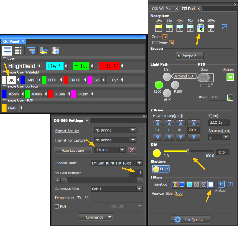 You may use the Widefield buttons to have the spinning disk move out of position or add an OC to the Confocal row of OCs to image through the spinning disk unit; this requires a longer exposure time, but is faster due to harware not moving.