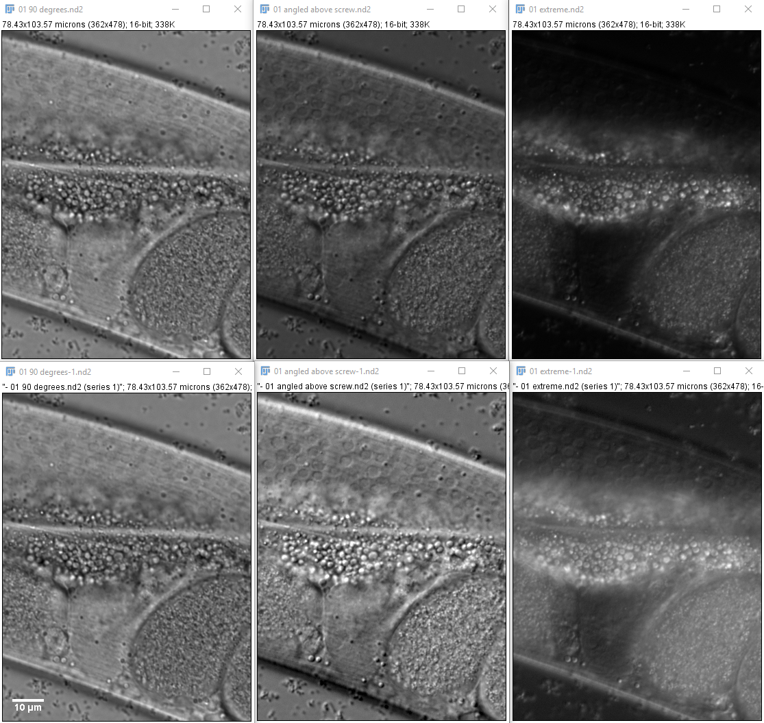 From left to right, least extreme to most extreme Nomarski in one of the directions the optics may be adjusted.