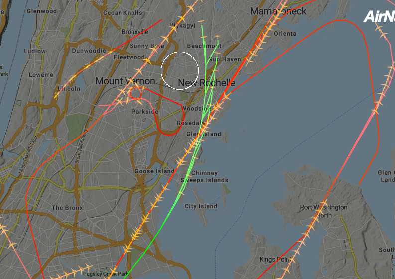 At the left there is a flight path green that turns more yellow and orange as a plane headed SE descends towards JFK.
