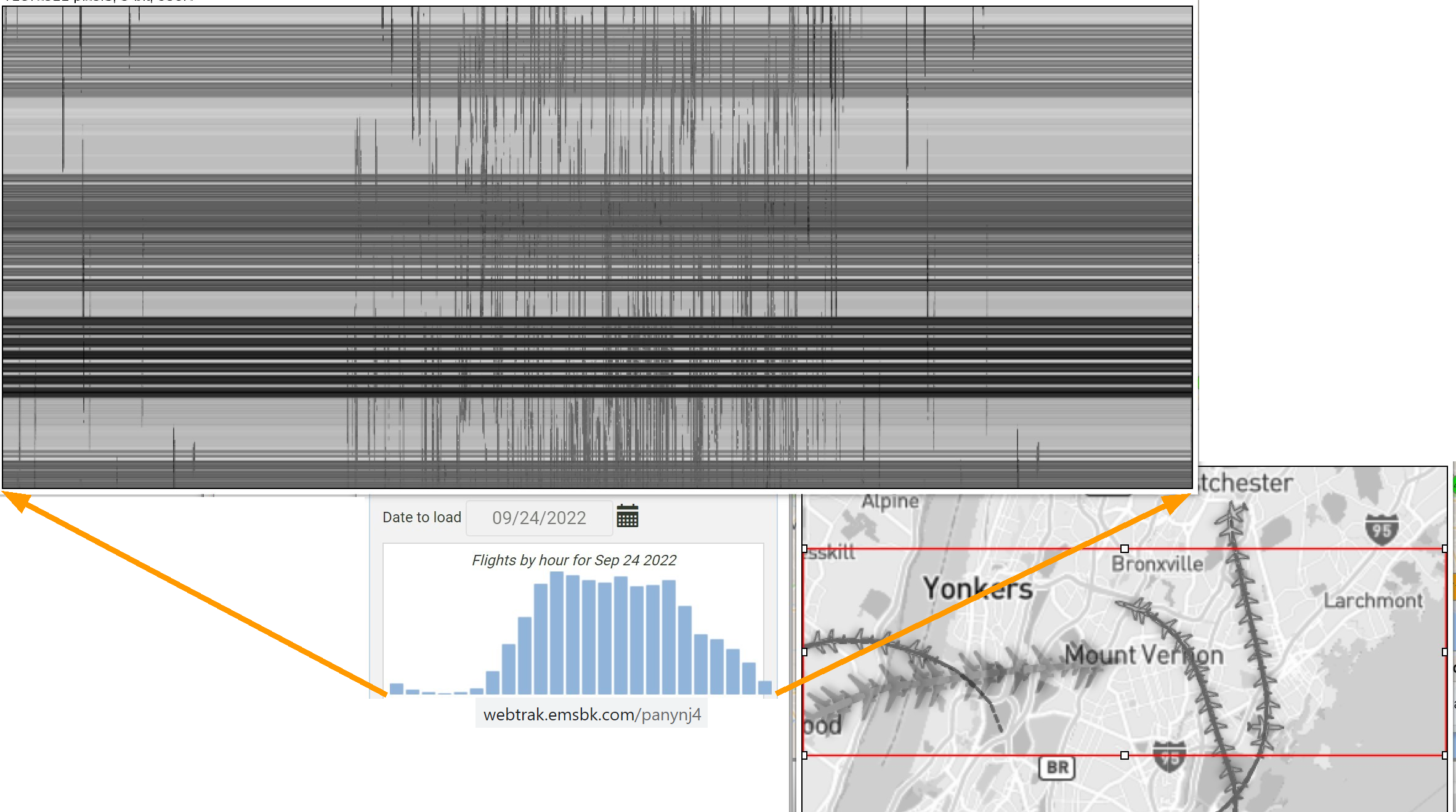The graph with the blue bars shows the data source's count of flights through the day for the entire region. The orange arrows mark how to align the kymogram with the blue bar histogram.