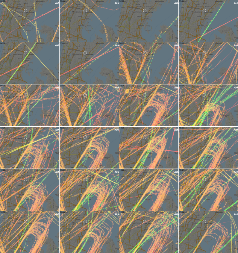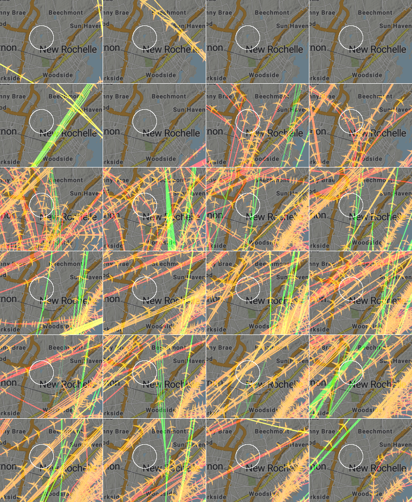 This montage is all flights per hour for 24 hours from midnight to midnight over Bronx and lower Westchester. The resolution is low to fit on the webpage. The second montage shows just the GL neighborhood at full resolution.