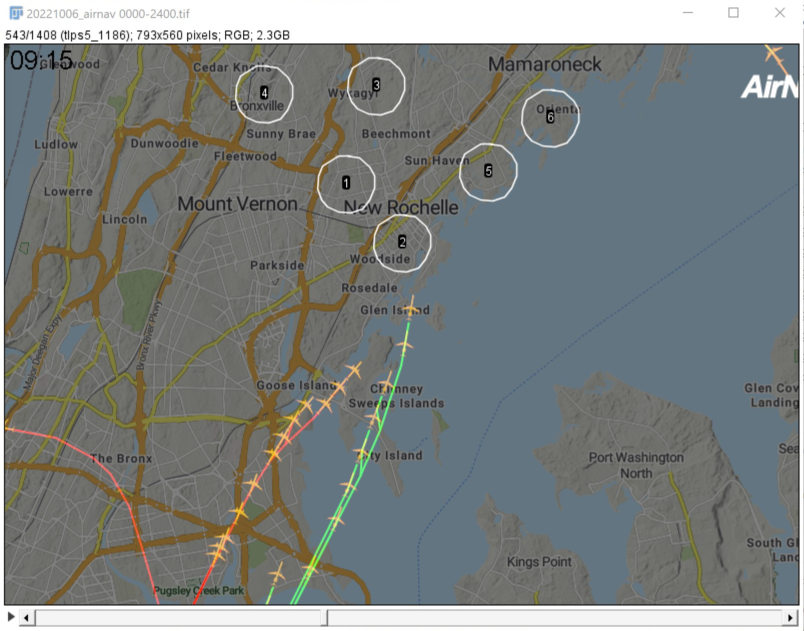 2 and 5, which are downtown New Rochelle and the Manor in Larchmont, had the most overhead traffic. A major trend is planes headed NE over Queens/Long Island which turn west to Larchmont where the turn SW counter parallel to their original heading to land at LGA. There are also planes that head SW along the coast of Westchester to joing the same path to land at LGA. Therefore, the coast receives more flights. This is consistent with other days, although the directions may be reversed.