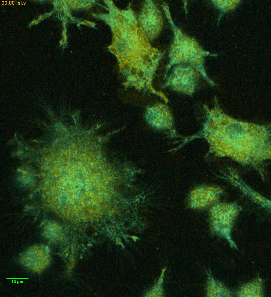 Live raw LR5 macrophage cell line was loaded with an itereation of a new dye being developed and was imaged with Zeiss 880 confocal in spectral mode with excitation at 405 and 561 nm and collection across the spectrum with 8.9 nm wide bins. Channels were then combined using avg projection method for each timepoint.