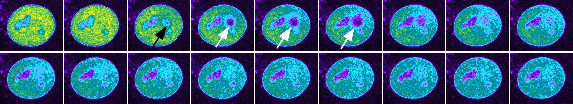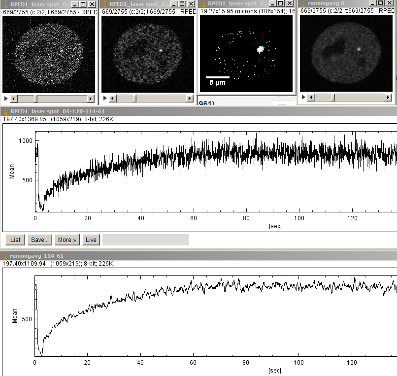 The dip in the curve shows a lot of bleaching during the photoactivation. Probably a briefer pulse of 405 nm laser would be enough to induce the photodamage and could improve kinetics of recruitment. The image below shows the bleach spot. These images are at 8 frames intervals after runavg8.