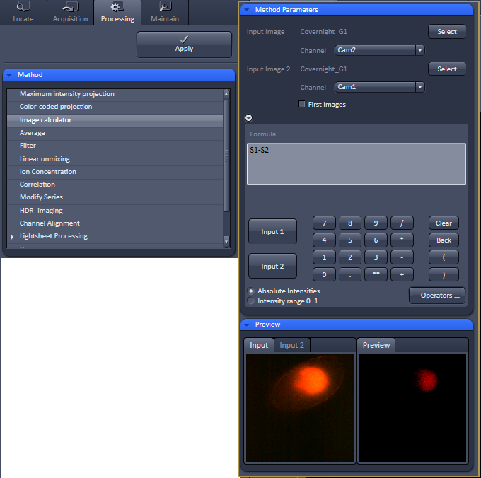 One example would be to cross subtract channels, or percentages of channels from the other cahnnel. Here is an example of how to do this in Zen. This takes each slice of a ZT series and subtracts the autofluoresence in channel1 from the signal detected in channel2. This highlights cells that are in channel2, but has the danger of removing channel2 real signal that is in the same XYZ position as autofluoresence. This has to be done on the raw data because projections don't preserve data specific to Z locations. |