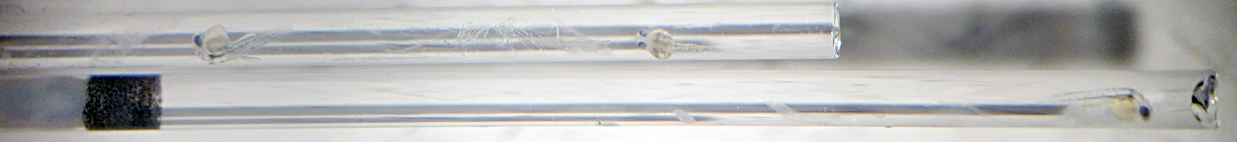 A live zebrafish is embedded in agarose inside a small bore pipette. After the agarose hardens, it is pushed out into the sample chamber of the microscope (teflon tip of plunger at far left). Imaging cannot be performed through the glass.